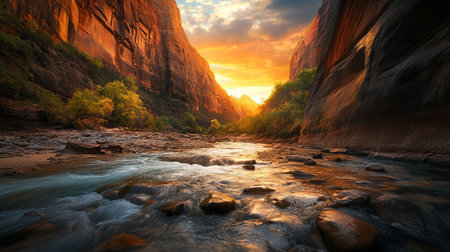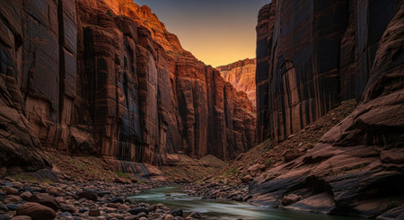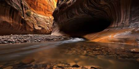 a narrow canyon showcases the mesmerizing flow of water, surrounded by golden hues and rich color palettes. this nature-inspired imagery captures the essence of cabincore and landscape inspirations. the 32k uhd resolution brings out the intricate details, while the light red and yellow tones add a touch of warmth to the scene. ai generated