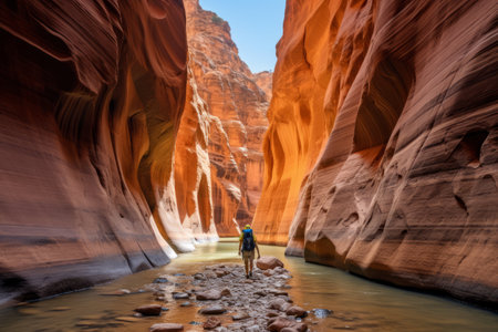hiker traversing rugged canyon, with the sun shining through the rock formations, created with generative ai