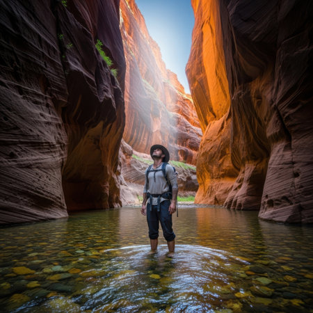 A man navigates through a serene water-filled canyon, surrounded by towering rock formations and the intimate beauty of nature, creating a peaceful adventure.
