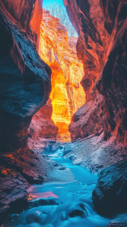 Sunlight streams into a narrow canyon, illuminating the colorful rock walls as a gentle river flows through the rocky terrain. Serenity and nature’s beauty combine harmoniously.