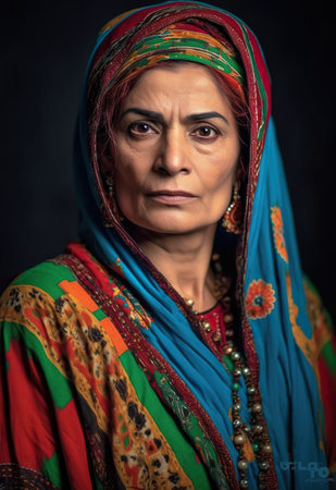 A mature Tajik woman 75 years old, gazes directly showcasing intricate traditional attire, rich cultural heritage of her nationality, evoking wisdom and grace. Brunette woman, wearing a headscarf. AI