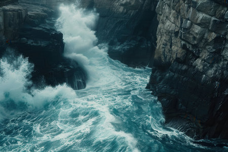 A breathtaking view of powerful ocean waves crashing against dramatic rock formations, creating a dynamic and adventurous scene.