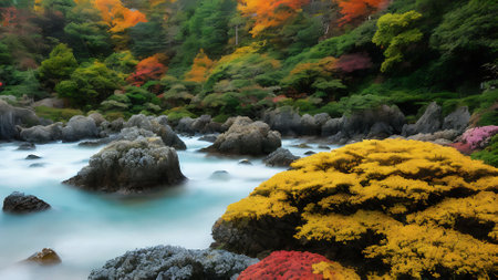 A vibrant river with white water rapids flows through a rocky landscape adorned with colorful autumn trees under a...
