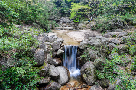 Stream of river along cedar trees in Yakushima island forest, Kagoshima Prefecture, Japan