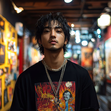 Portrait of a fashionable man wearing a modern outfit, surrounded by colorful artwork indoors. The urban environment and contemporary style highlight artistic creativity and individuality, set against a backdrop of dynamic lighting.
