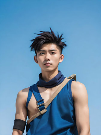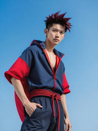 Portrait of a Japanese man with short spiky hair, dark red hair color