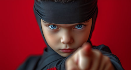 A young child dressed as a ninja stands confidently, pointing forward with determination. The vibrant red background highlights the focus and intensity of the moment.