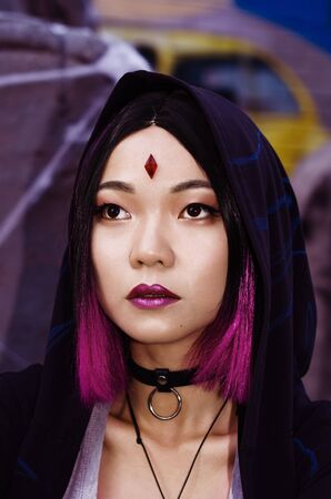 Japan anime cosplay. Colorful portrait of a young attractive smiling Asian woman in a coat with creative make-up wearing a pink wig. Trendy Japanese girl using smartphone listening music in earphones walking on the city street.