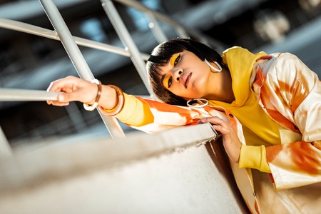 Attractive brown girl with big dark eyes resting near the parapet looking in camera lens