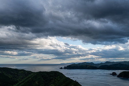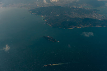 Aerial view through the clouds to the sea bay with coastal hills. Top view from the clouds to Japan islands. High quality photo