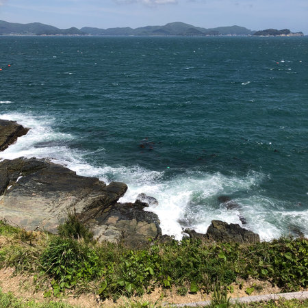Seascape with waves crashing on the rocks, South Korea.
