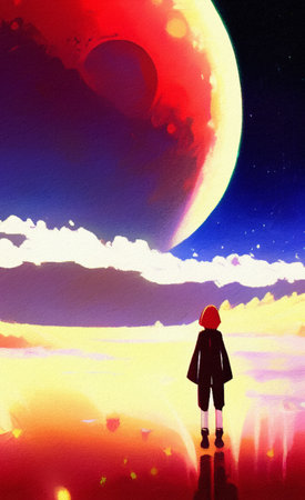 Digital painting illustration of little girl sits on the moon and looks into the distance, in the sky there is a space landscape and planets. Fantasy wall art drawing in modern