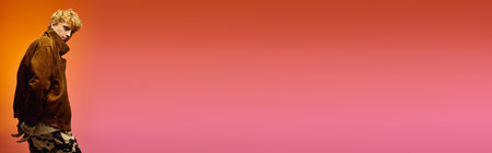 A confident man models contemporary holiday fashion against a warm, colorful backdrop. His outfit blends elegance with modern flair, perfect for festive celebrations.