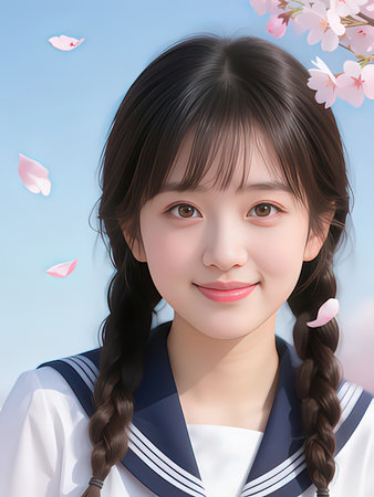 cute asian japanese school girl with cherry blossom