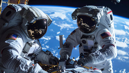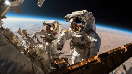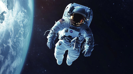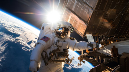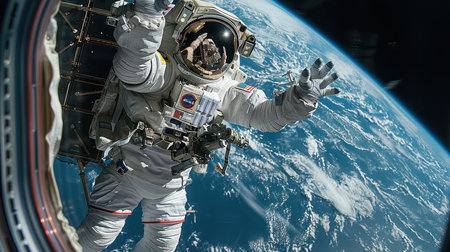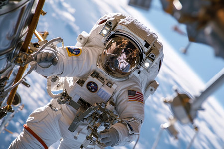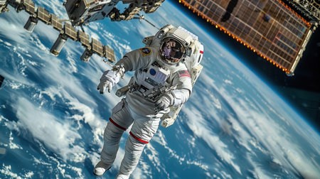 An astronaut floats gracefully in space, working outside the International Space Station while Earth is visible below.