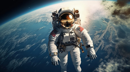 A lone astronaut drifts in space against the backdrop of the Earth, witnessing a breathtaking sunrise. The image captures the essence of exploration, solitude, and the beauty of our planet from above. AI generated image