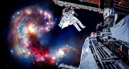 Astronaut spaceman do spacewalk while working for space station. Mixed media