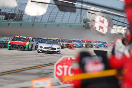 Ryan Blaney (12) battles for position to start the Dixie Vodka 400 at Homestead Miami Speedway in Miami , Florida.