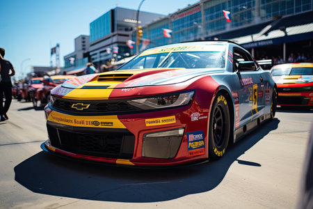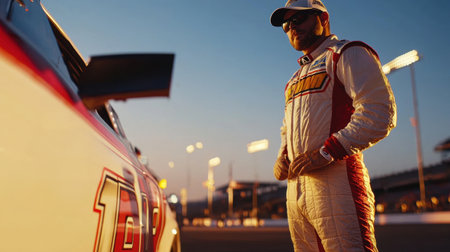 Confident driver standing beside his vehicle, car at sunset, ready to take on the competition in an adrenaline-fueled Nascar race.