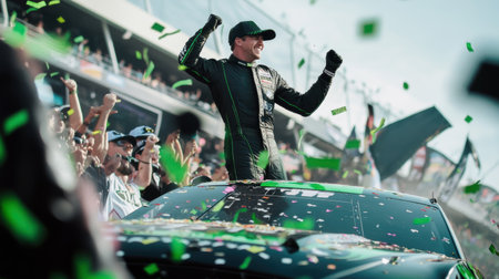 Man, victorious driver celebrating atop his car as confetti rains down, marking the triumph after a high-octane Nascar race.