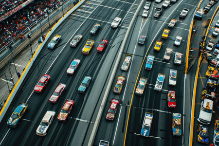 A dynamic scene featuring cars lined up at the starting grid, capturing the anticipation and excitement of race day. The vibrant colors and reflections enhance the thrilling atmosphere of motorsport.