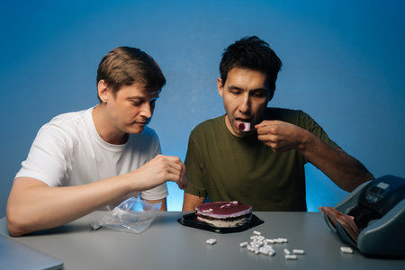 Two men consuming cake with scattered pills near money, depicting gathering involving substances and celebration. Concept of party with substance consumption.