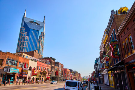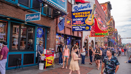 NASHVILLE, TENNESSEE - AUGUST 20, 2018: Honky-tonks on Lower Broadway. The district is famous for the numerous country music entertainment establishments.