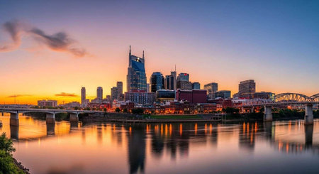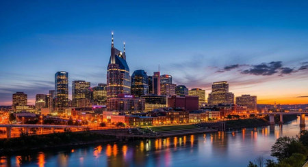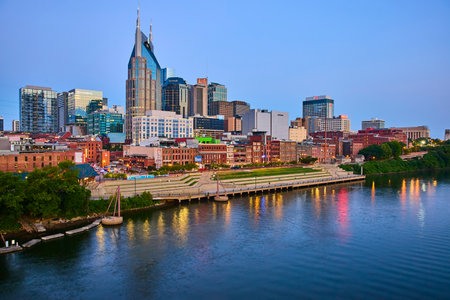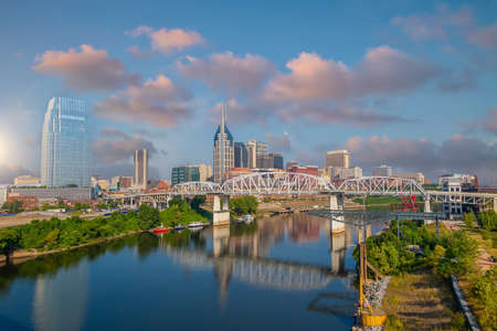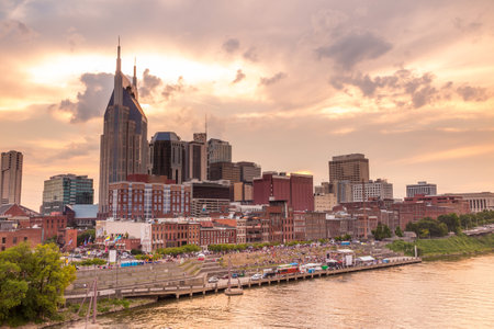 Nashville, Tennessee downtown skyline with Cumberland River in USA at sunset
