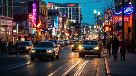 The lively street in Nashville showcases a mix of traffic and pedestrians, illuminated by colorful neon signs against a twilight sky. The atmosphere buzzes with energy and excitement.