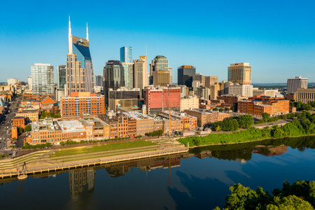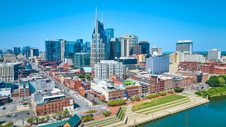 Nashville, Tennessee - 28 June 2021: Aerial drone view of the financial downtown district of Nashville and the Cumberland River