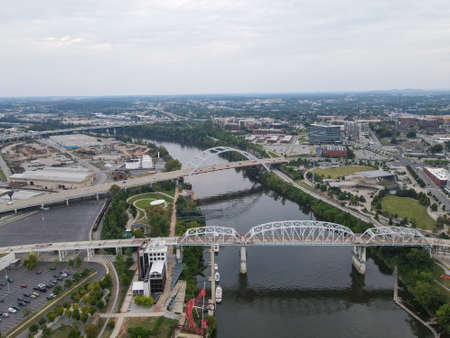 Aerial view of the city of Nashville, TN located on the Cumberland River. The city is the capitol for the Volunteer State.