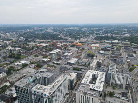 Nashville, Tennessee - 28 June 2021: Aerial drone view of the financial downtown district of Nashville