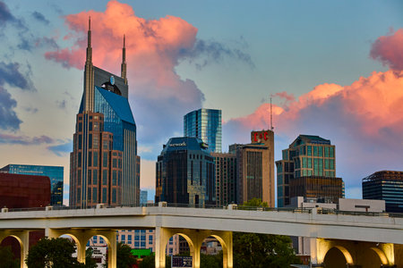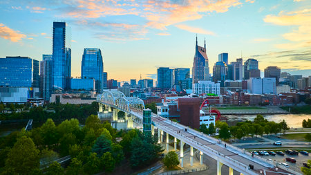 Aerial View of Nashville Skyline with Sunset Over Pedestrian Bridge