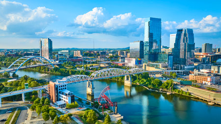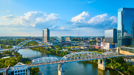 Aerial Panorama of Nashville Skyline with Pedestrian Bridge and Riverfront
