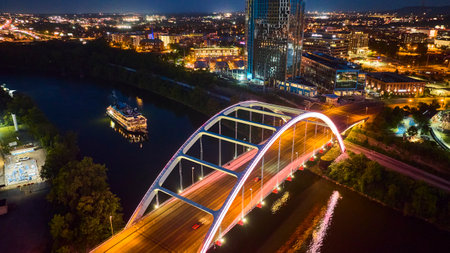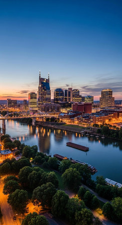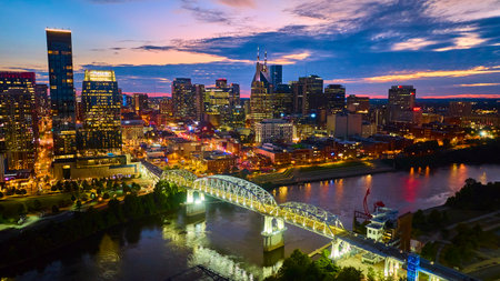 Aerial View of Nashville Nightlife and Skyline with Riverfront Reflections