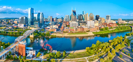 Panoramic skyline view of Broadway district of Nashville over Cumberland River at day time, Tennessee, USA. This city is known as a center for the music industry, especially country music