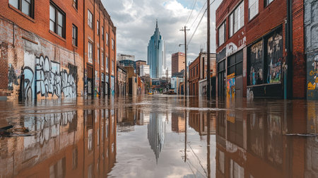 A flooded urban scene showcasing reflections of buildings and a skyscraper under cloudy skies, highlighting the impact of weather on city life.