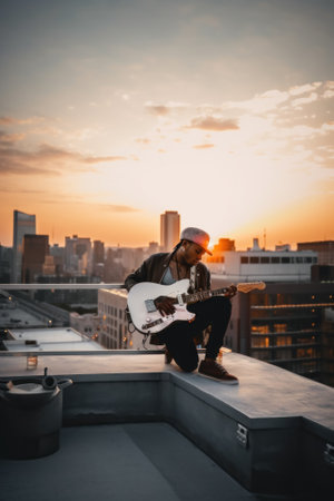 A man sitting on top of a building holding a guitar. Generative AI image.