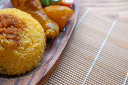 Yellow rice with yellow chicken on the wooden bench in morning.