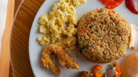 Fried rice or Nasi Goreng with scrambled egg, chicken and shrimp