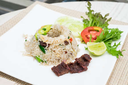 Thai food - Kao Cluk Ka Pi Mixed Cooked Rice with Shrimp Paste Sauce on white round dish
