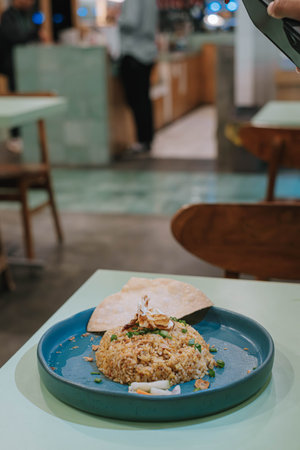 Food photography, Nasi goreng or Indonesian fried rice, served with fried egg and chicken curry