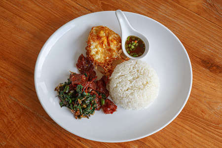 Rice topped with stir-fried pork, shrimp paste and chili on wooden plate