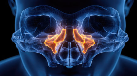 Realistic rendering of the sphenoid joint in context with the ethmoid and frontal bones, softly lit