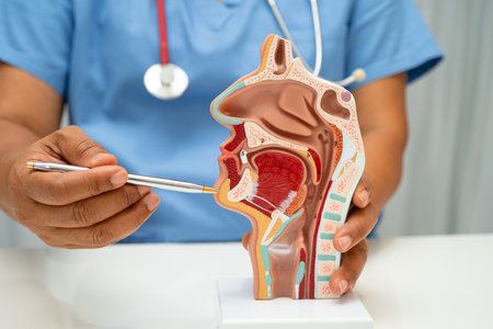 Asian doctor with nasal oral throat cavity neck human anatomy model for study diagnosis and treatment in hospital.
