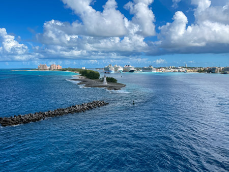 Nassau, Bahamas - October 13, 2021: An aerial view of the cruise ship harbor in Nassau, Bahamas from a cruise ship that is sailing away.