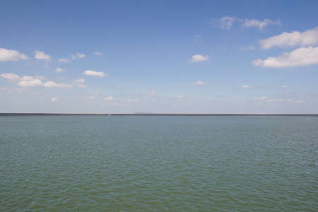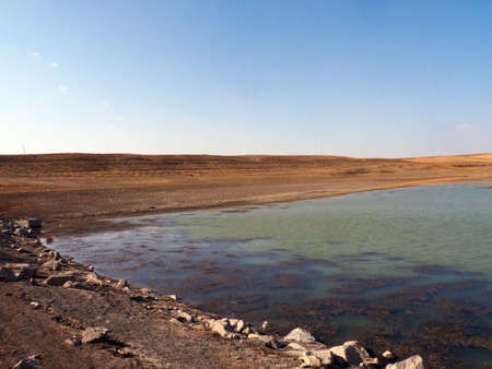 lake view of a dam among the plain of an arid climate with blue sky and few clouds, without people and animals, place of mountain hike, great view