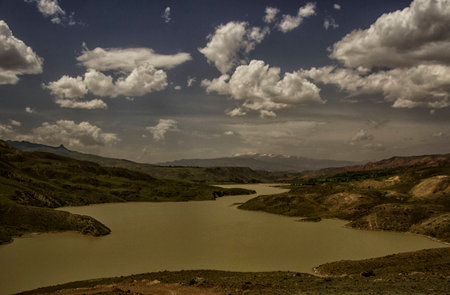 A landscape with mountains and a river in light haze near the city of Van in the Eastern Anatolia region of Turkey