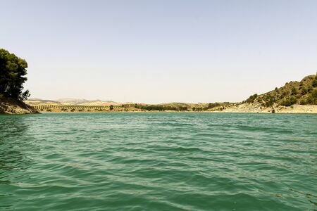 the Iznajar reservoir, in Andalusia, Spain, in a calm and sunny spring day, in a panoramic format to use as web banner or header
