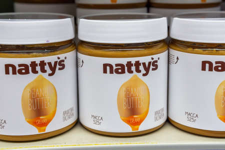 Tyumen, Russia-June 05, 2020: nattis peanut butter in a jar. Natural food and organic food. Selective focus.
